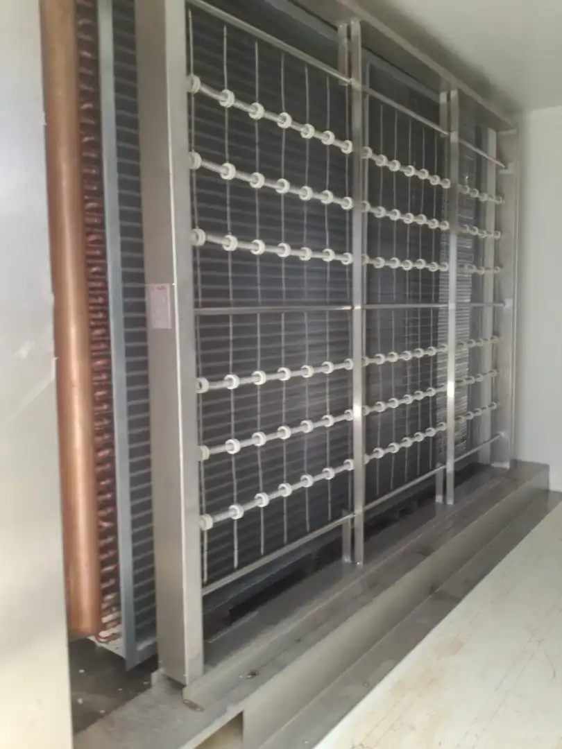 Il sistema integra compressori a vite semiermetici e un evaporatore a fascio tubiero per il fluido vettore, oltre a un’unità di trattamento aria (UTA) costruita su misura. Il vano di prova è mantenuto in pressione tramite un circuito di rinnovo aria con sistema a ruota entalpica che assicura un punto di rugiada fino a -40°C, permettendo test prolungati a temperature negative senza formazione di ghiaccio o brina.
